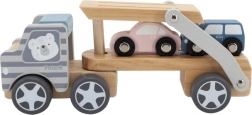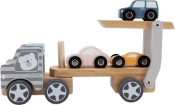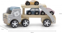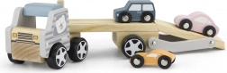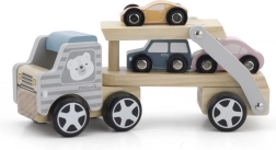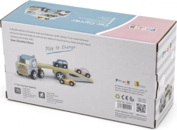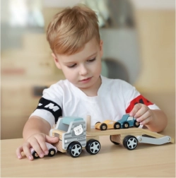 Remorca pe două niveluri cu rampă rabatabilă susține jocul realist și învățarea secvențelor – copiii încarcă și descarcă singuri mașinuțele.