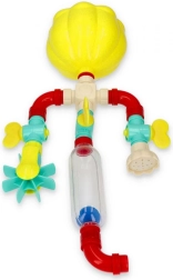 Un sistem acvatic vesel cu pâlnie, tuburi și rotiță de apă înveselește fiecare baie. Copilul toarnă apă în pâlnie și urmărește cum curge pe diverse trasee. Această jucărie interactivă dezvoltă coordonarea mână–ochi și susține descoperirea naturală a fenomenelor fizice.