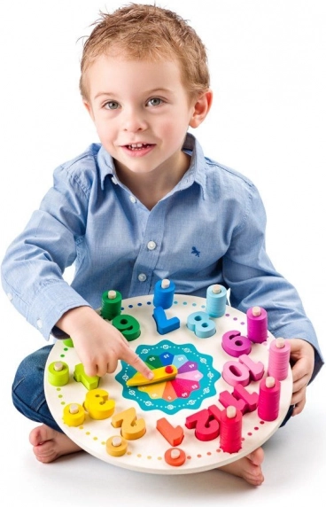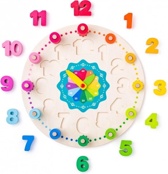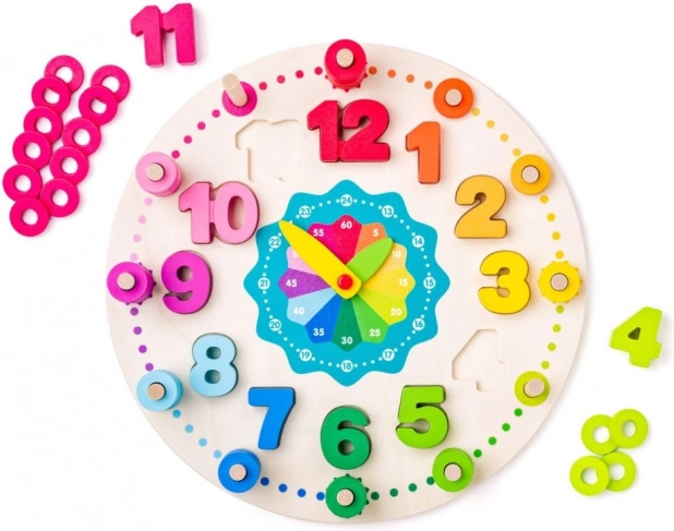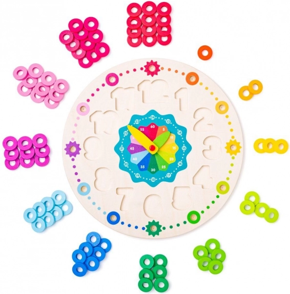 Ceasul didactic din lemn, cu diametrul de 30 cm, are un cadran principal cu ace mobile și două scale auxiliare pentru 13–24 de ore și minute din 5 în 5. Copiii exersează setarea precisă a timpului, motricitatea fină și gândirea logică. Cuburile detașabile cu cifrele 1–12 dezvoltă recunoașterea formelor și a culorilor, în timp ce deschiderile din spatele cifrelor servesc pentru introducerea bețelor și apoi înșirarea inelelor.