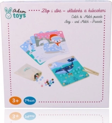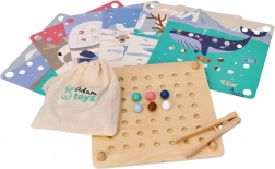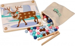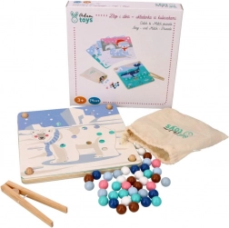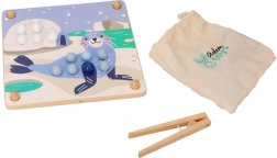 Acest joc educativ distractiv îmbină curiozitatea naturală a copiilor cu antrenarea abilităților: folosind penseta din lemn, copiii mută biluțele și le așază în orificii după culori și șabloane cu motive de animale arctice (pinguin, focă, ren, urs polar). Jocul susține concentrarea, priza precisă și siguranța mișcărilor mâinii – ideal pentru preșcolari.