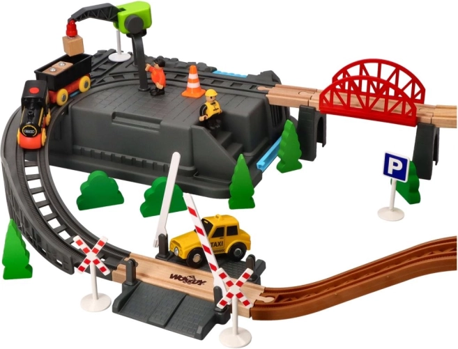 Acest set șină tren pentru copii cu 63 de piese oferă nenumărate oportunități pentru joacă creativă. Setul este ideal pentru dezvoltarea abilităților motorii și imaginației copiilor. Conține trenuri colorate, poduri, copaci, semne de circulație și alte accesorii care aduc elemente realiste în joc.