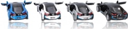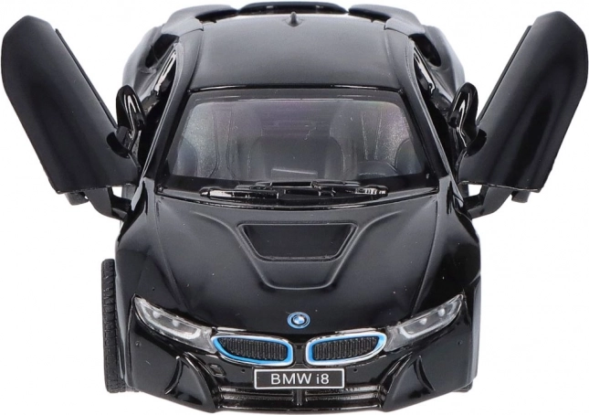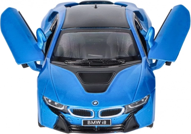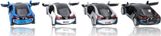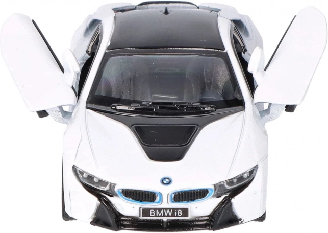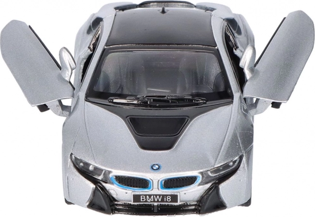 Execuția detaliată a modelului metalic BMW i8 include elemente de design precise, precum grila caracteristică BMW și forma farurilor.