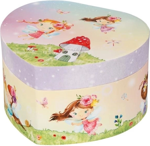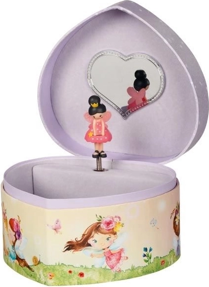 Elegantă cutie muzicală pentru bijuterii cu motiv de zână, care va încânta orice mică domnișoară. La deschidere răsună melodia Lacul lebedelor, iar zâna începe să danseze în fața oglinzii în formă de inimă. Ideală pentru păstrarea în siguranță a bijuteriilor pentru copii și a mărunțișurilor, o decorațiune superbă pentru camera copilului.