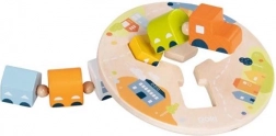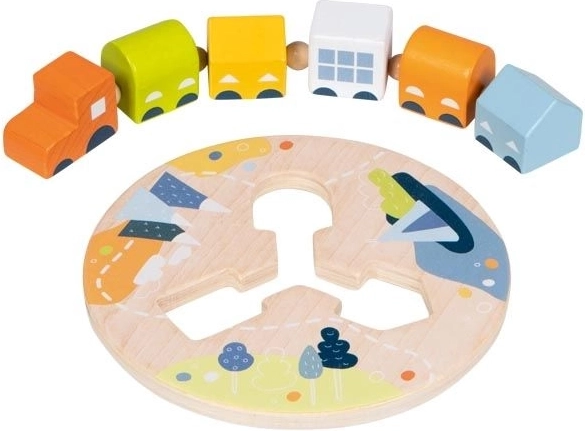 Acest trenuleț din lemn de calitate de la marca GOKI este conceput ca un joc de îndemânare ingenios pentru dezvoltarea abilităților copiilor. Locomotiva cu cinci vagoane de forme diferite înaintează pe baza de înșirat și poate continua doar atunci când vagoanele sunt așezate la locul potrivit. Astfel, copiii învață în mod natural logica și coordonarea mână–ochi.