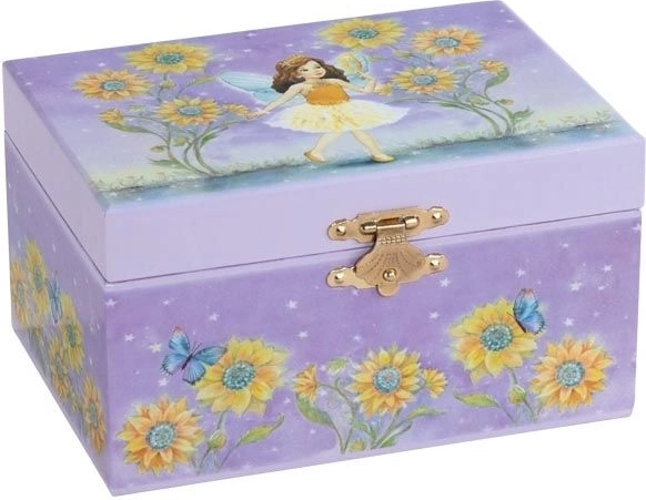 Această cutie pentru bijuterii, în stilul unei cutii muzicale clasice, va bucura orice copil care dorește să își păstreze comorile cu eleganță. La deschiderea capacului răsună melodia delicată din baletul Lacul lebedelor, iar mica balerină rotativă începe să danseze în fața oglinzii încorporate. Motivul cu floarea-soarelui conferă cutiei un aspect jucăuș și totodată delicat.