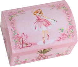 Această cutie de bijuterii în stil tradițional de cutie muzicală este un frumos accesoriu pentru camera copilului. La ridicarea capacului se aude motivul fermecător din Lacul lebedelor, iar micuța balerină dansează în fața oglinzii sale. Designul cu tematică de balet sprijină dragostea pentru muzică și estetică.