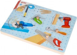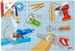 O altă ofertă interesantă este puzzle-ul sonor cu unelte de la Goki. În timpul jocului, copilul potrivește piesele în spațiile goale. Puzzle-ul este realizat din lemn natural, are o bază solidă și 6 piese cu mânere. Veți găsi aici cele mai îndrăgite unelte, precum șurubelniță, ciocan, polizor, ferăstrău, șurubelniță electrică și cheie. După așezarea piesei pe bază, copilul va auzi un sunet. .