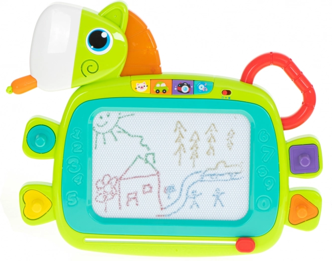 Elementele interactive aduc sunete de animale, sunete de mijloace de transport, sunete din gospodărie și melodii vesele. Jucăria are 2 niveluri de volum și posibilitatea de a opri sunetul complet. Stiloul în formă de morcov, introdus în „gurița” căluțului, produce un efect de trosnit. Marginile tablei sunt decorate cu litere și cifre reliefate – ideale pentru primul contact cu formele.