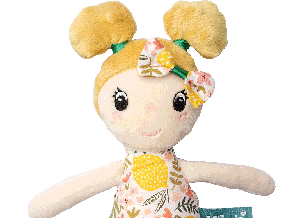 Datorită detaliilor feței brodate, fără piese mici detașabile, este sigură chiar și pentru bebeluși 0+. Umplutura antialergenică și suprafețele fine de tip frotir și minky oferă confort atât la joacă, cât și la culcare.