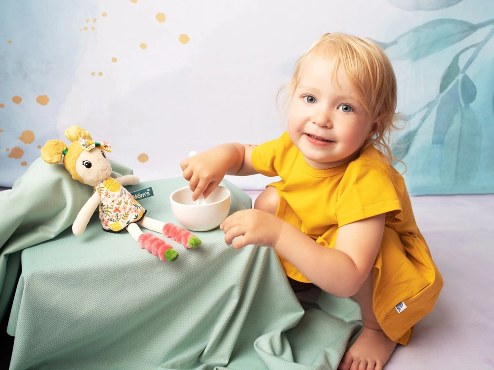 Păpușa Maja atrage prin codițele blonde cu fundiță și rochița colorată, care sprijină dezvoltarea senzorială a copiilor. Este cusută manual în Polonia din materiale de calitate, iar datorită construcției ușoare copiii o pot lua cu ei oriunde.