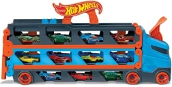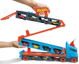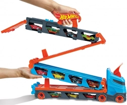 Transformă camionul în câteva clipe într-o pistă de curse completă. Transportorul ascunde până la 20 de mașinuțe în spatele ferestrelor transparente, astfel încât ai colecția mereu la vedere. Trăgând de mâner, semiremorca se desfășoară într-o pistă cu două benzi de 1,8 m, iar cabina devine o stație dublă de lansare pentru starturi corecte.