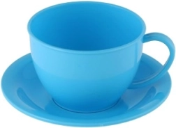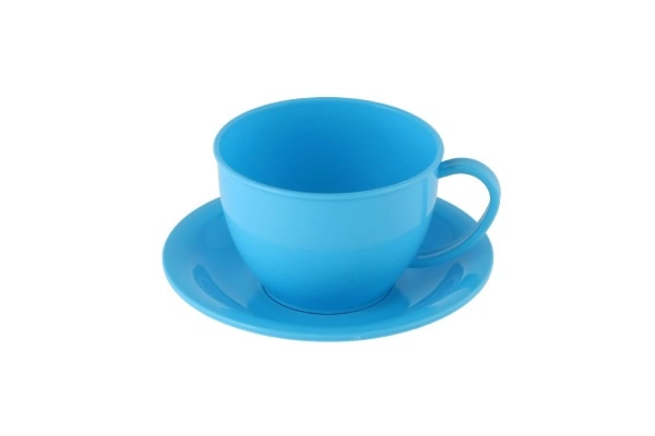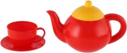 Ceainic roșu și patru cești colorate cu farfuriuțe permit „prepararea” și servirea ceaiului pentru toată familia sau prieteni.