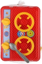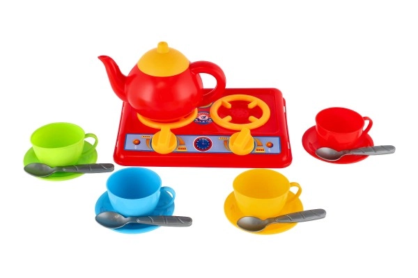 Acest set colorat pentru micii bucătari oferă tot ce este necesar pentru gătit și servire distractivă. Aragazul compact din plastic, cu butoane de control, este completat de un ceainic roșu și patru cești cu farfuriuțe și lingurițe – ideal pentru petreceri de ceai pentru copii.