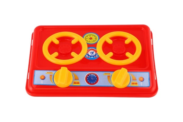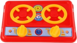 Aragaz roșu cu două plite și butoane rotative stimulează imaginația și îi învață pe copii bazele gătitului într-un mod sigur.