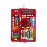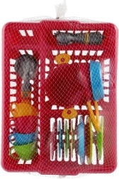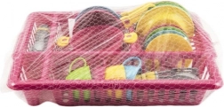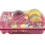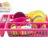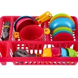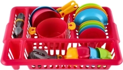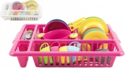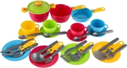 Un set vesel de bucătărie pentru copii, într-un uscător practic, aduce ore de distracție creativă. Conține tot ce au nevoie micii bucătari: farfurii, cești cu farfurioare, tacâmuri, oală cu capac și tigăi. Culorile intense atrag atenția și dezvoltă imaginația, motricitatea fină și obiceiurile de ordine – după „gătit”, vasele se pun ușor în uscător, ca la mama acasă.