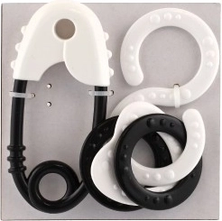 Acest set de jucării zornăitoare conține un ac clasice și un inel cu cercuri.
