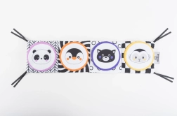 Cealaltă parte ascunde clapete rotunde pufoase pentru îndrăgitul joc „cucu-bau”, sub care copiii descoperă simboluri ale hranei animăluțelor. Clapetele conțin material foșnitor pentru o stimulare auditivă delicată. Bebelușii mai mici explorează astfel forme și contraste, iar cei mai mari asociază animăluțele cu hrana lor.
