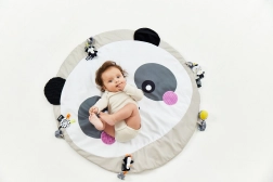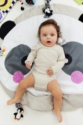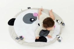 Descoperă covorașul senzorial moale și sigur pentru bebeluși cu motiv panda de la GAGAGU. Modelele contrastante alb-negru susțin dezvoltarea vizuală, texturile diferite de pe urechi și obrăjori dezvoltă simțul tactil, iar materialul foșnitor integrat stimulează auzul. Covorașul este fără piese din plastic, plăcut, moale și dens pentru confort termic, cu bucle practice pentru prinderea altor jucării.