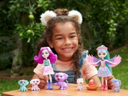 Vă prezentăm păpușa Filia Finch din gama Enchantimals, însoțită de familia ei drăguță de papagali. Filia are păr lung turcoaz și o ținută colorată, incluzând un top și o fustă originale cu păsări. Pe picioare poartă încălțări roz care se potrivesc perfect cu aripile ei elegante roz.