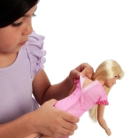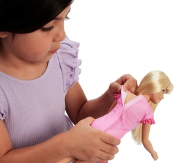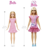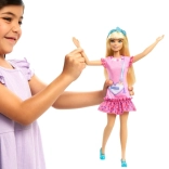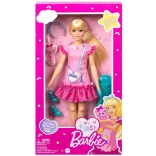 Intrați într-o lume în care prietenia începe și imaginația nu are limite. Păpușa din gama Prima mea BARBIE este mai mare, ușoară și plăcut flexibilă, astfel încât mânuțele mici să o poată ține, îmbrăca și așeza în diverse poziții cu ușurință. Rochia roz este decorată cu detalii jucăușe precum volănașe și grafica unei genți în formă de inimă, iar bentița asortată și pantofiorii nu lipsesc. Părul blond lung invită la pieptănat și creare de coafuri, dezvoltând în mod natural motricitatea fină.