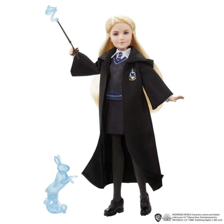 Trăiți momente magice de la Hogwarts cu păpușa Luna Lovegood inspirată din film. Luna poartă o robă neagră cu stema casei Ravenclaw, uniformă școlară și o baghetă detaliată cu efect albastru de vrajă. Figurină translucidă de Patronus în forma unui iepure adaugă adevărata magie poveștii voastre.