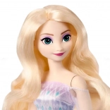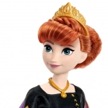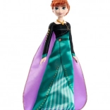 Anna poartă o rochie verde-neagră cu pelerină purpurie, iar Elsa o rochie alb-liliachie cu pelerină translucidă – imprimeuri și accesorii detaliate pentru joc autentic.