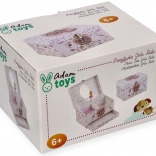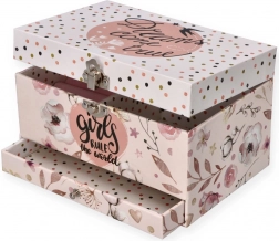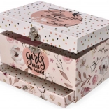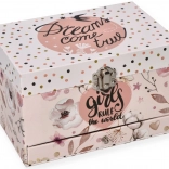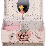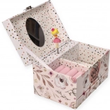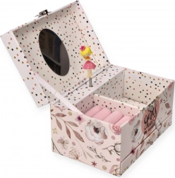 Această casetă delicată, roz, cu motiv floral și cu buline, ascunde în interior tot ce adoră micile domnișoare: la ridicarea capacului pornește melodia, iar balerina se învârte pe ax în fața oglinzii ovale. În interior găsești un spațiu bine organizat, cu pernuțe pentru inele și compartimente pentru mici comori.