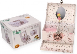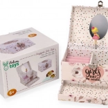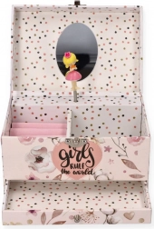 Această casetă de bijuterii adorabilă, cu mecanism muzical și balerină rotativă, va încânta orice mică domnișoară. Are compartimente practice, pernuțe pentru inele, sertar glisant și oglindă ovală. Ideală pentru păstrarea bijuteriilor și micilor comori și ca frumoasă decorațiune pentru cameră.