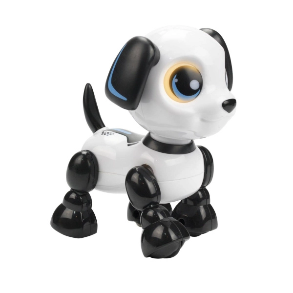 Căţeluş robotic interactiv cu mers, mişcare a capului, ochi LED şi sunete. Dimensiune 12 cm, alimentare 2× AAA. Jucărie grozavă pentru copii de la 3 ani.
