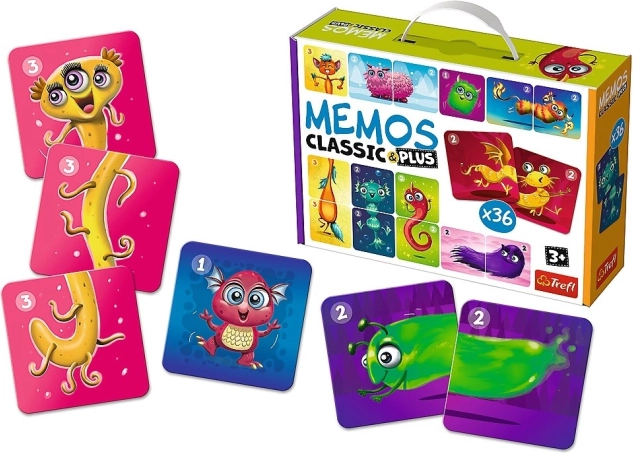 Pexeso Classic & Plus Monstruoși drăgălași 3‑în‑1 este ideal pentru copiii mici care adoră noile provocări. Cu acest joc, copiii pot începe cu varianta simplă și pot încerca treptat niveluri mai dificile. Jocul conține 36 de carduri mari din carton, cu ilustrații drăgălașe, care servesc nu doar la exersarea memoriei, ci și la îmbunătățirea concentrării.
