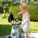 Grătarul este proiectat pentru ușurința de mutare datorită roților și mânerului, astfel putând fi amplasat în orice parte a grădinii sau casei, după nevoie. Include și un raft pentru a depozita toate accesoriile, facilitând astfel organizarea și curățenia jocului.