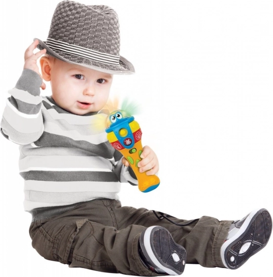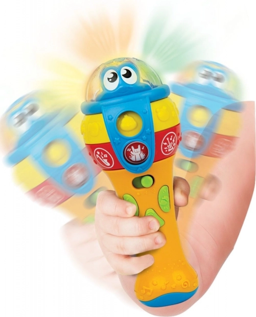 Prin apăsarea unui buton, microfonul amplifică vocea copilului și prin mișcarea microfonului se activează efectele de ecou, ceea ce face jocul și mai distractiv.