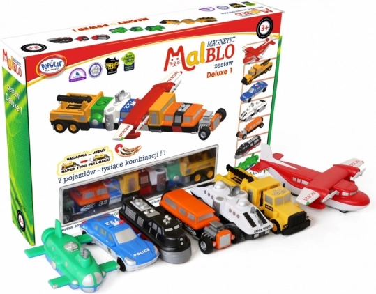 Setul de construcție MalBlo MAGNETIC Deluxe este o jucărie inteligentă pentru micii constructori. 21 de piese în pachet (7 vehicule preasamblate) permit asamblarea a peste 1000 de combinații diferite – de la mașini și camioane până la avioane și mașinării ale viitorului. Piesele au o forță magnetică și mecanică optimă a îmbinării, astfel încât sunt ușor de manevrat și rămân bine fixate.
