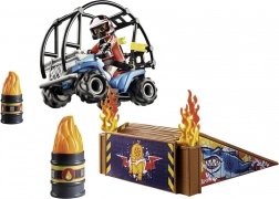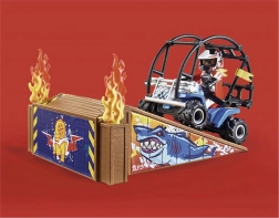 Porniți la maximum cu spectacolul de cascadorii de la PLAYMOBIL! Urmăriți-l pe cascador cum pornește cu quadul, străbate rampa de foc și execută un salt ce-ți taie respirația. Setul este o intrare excelentă în lumea Stunt Show și invită la povești creative.