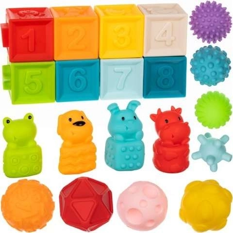 Au culori vii frumoase, care stimulează perfect dezvoltarea copilului dumneavoastră. Datorită adânciturilor și proeminențelor speciale, copilul poate îmbina cuburile în șiruri. Jucăriile senzoriale formează abilitatea de a primi, înțelege și reacționa la stimulii din mediu. Cu ajutorul cuburilor, putem îmbunătăți coordonarea mișcărilor și stimula simțurile, cum ar fi auzul, văzul sau atingerea. Cuburile emit un sunet clasic fin la apăsare, care va fi o experiență plăcută și interesantă pentru copilul dumneavoastră. Cuburile sunt fabricate dintr-un material special moale, care este foarte moale și ușor și nu conține substanțe nocive, astfel încât pot fi folosite ca inel de dentiție pentru bebeluși. Blaturile senzoriale sunt vizual atrăgătoare și au un finisaj atent, precis. Culorile lor vii, diferitele forme și dimensiuni vor atrage privirea copilului și cu siguranță îl vor încuraja să se joace.