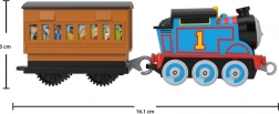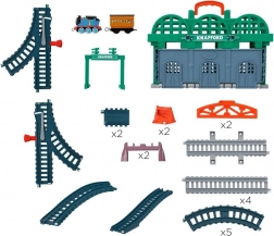 Locomotiva THOMAS pe împins parcurge șinele din plastic, peste pod și pe lângă semnalizare. Copiii pot construi liber și modifica traseul.