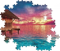 Scufundă-te în ritmul meditativ al asamblării cu puzzle-ul CLEMENTONI Peace – Living the Present. Culori bogate, tipar atent și piese care se potrivesc perfect oferă o experiență plăcută și o imagine superbă a unei căsuțe pe piloni deasupra apei liniștite, la apus.