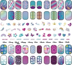 Lacuri colorate, unghii false și autocolante tematice pentru un mix creativ de motive, de la steluțe la dungi și degradeuri.