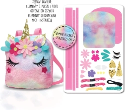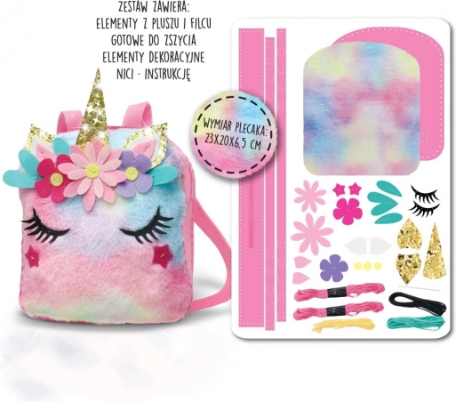 Setul pentru cusut – rucsac cu unicorn – este o idee ideală pentru activități recreative. Cu ajutorul acestui set, fiecare fată poate coase un rucsac cu dimensiunile aproximative de 23 cm x 20 cm x 6,5 cm, care va fi completarea perfectă a unei ținute la modă. Setul conține: elemente din fetru și pluș pregătite pentru cusut, elemente decorative, ață, ac de plastic, instrucțiuni.