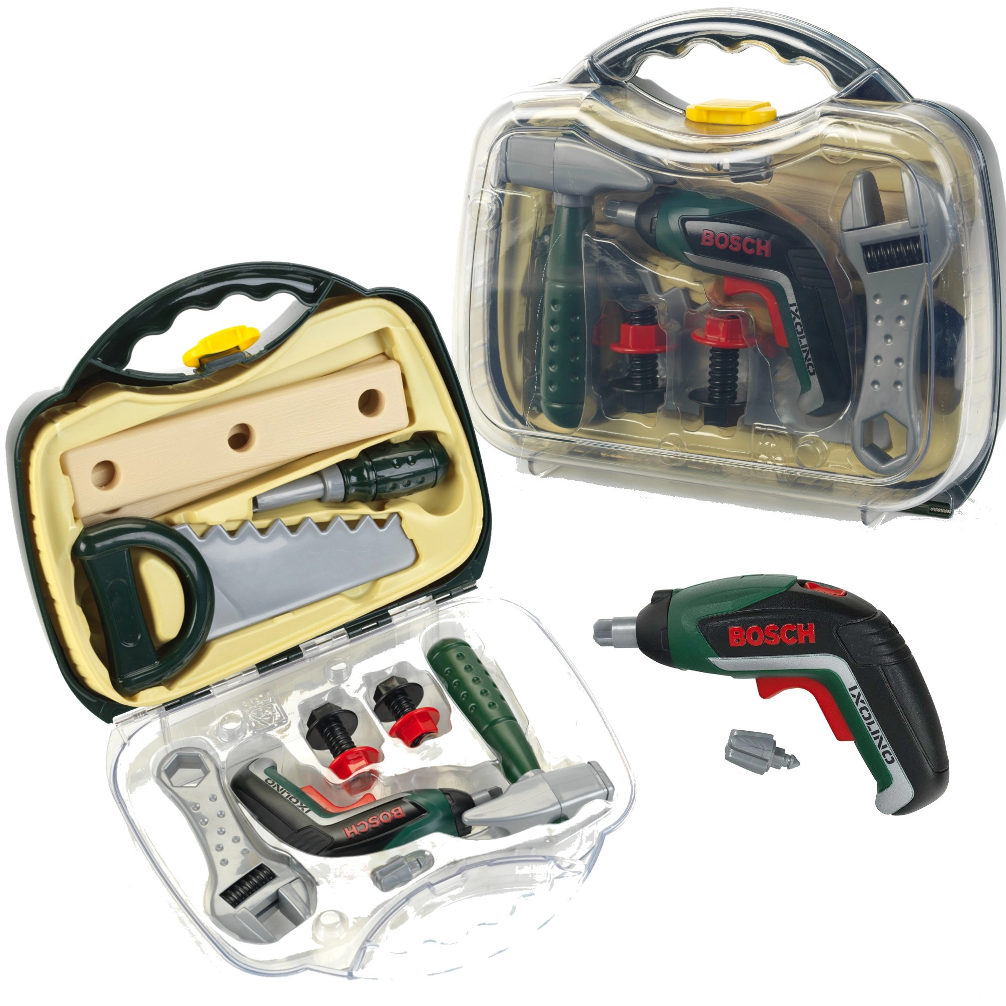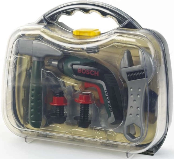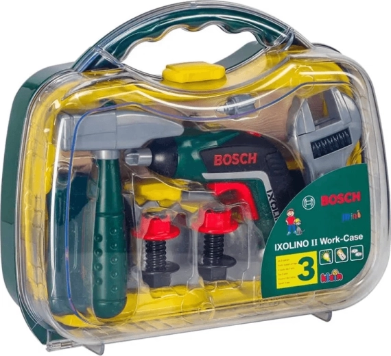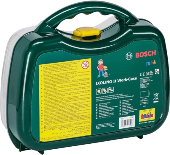 Geantă pentru copii cu unelte din gama licențiată BOSCH Mini de la KLEIN, care oferă un joc realist de mic reparator. Înăuntru găsești șurubelnița electrică Ixolino II pe baterii, cu rotație dreapta/stânga și sunet de motor, completată de alte instrumente rezistente. Geanta robustă verde închis cu capac transparent și două încuietori roșii păstrează totul în siguranță și este ideală pentru micii meșteri de la 3 ani.