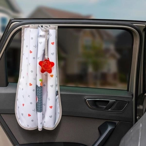 Instalarea este foarte simplă datorită celor patru magneți puternici, care fixează rapid și sigur parasolarul pe rama metalică a ușii, fără a folosi ventuze sau cârlige. Când nu mai este necesar, poate fi pliat ușor și legat cu ajutorul bretelelor cusute pentru depozitare facilă. Steaua specială cu efect strălucitor oferă în plus distracție pentru micii pasageri, făcând călătoria să treacă mai repede.