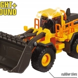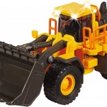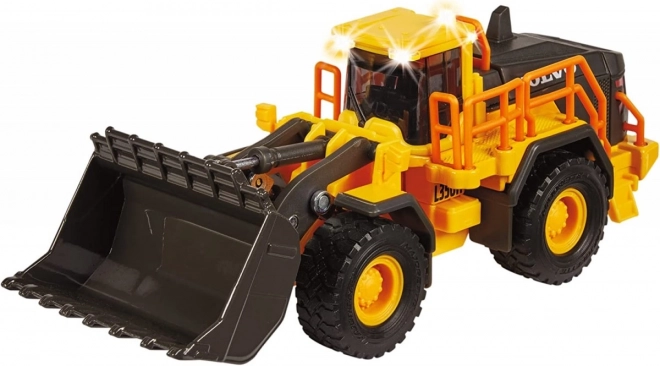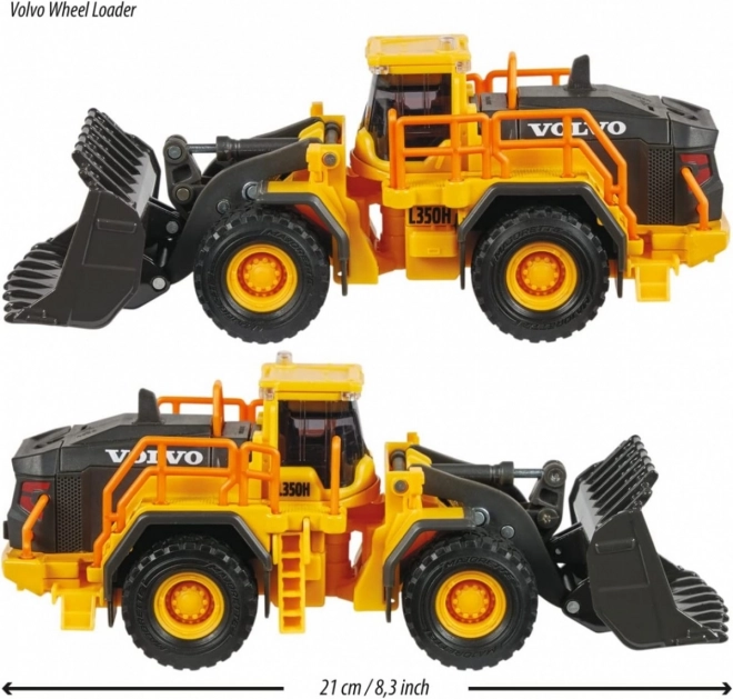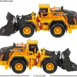 Încărcător VOLVO licențiat, fără motor, cu funcții luminoase și sonore. Cabina este din metal. Anvelopele moi din cauciuc fac față cu ușurință suprafețelor dificile de pe șantier. Elemente mobile: ușă spate care se deschide, cupă și cabină; datorită direcției, vehiculul poate vira cu ușurință la dreapta și la stânga. Lungime: 21 cm.