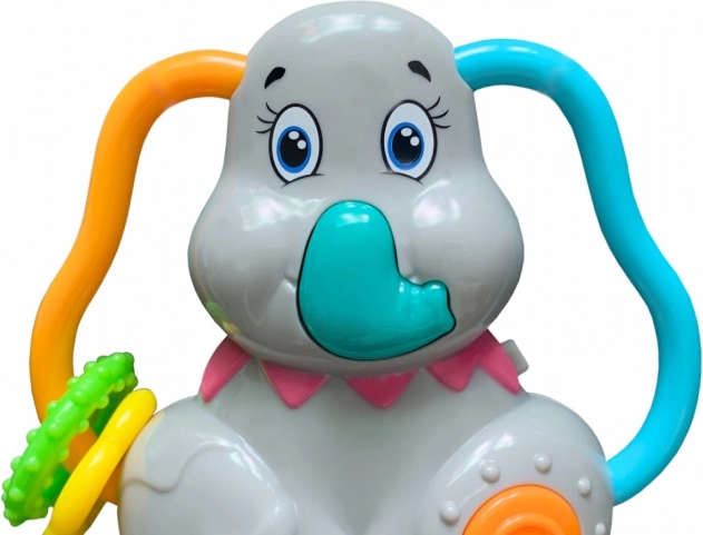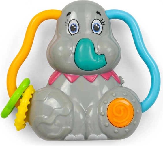 Design interactiv: Zornăitorul în formă de elefant este dotat cu urechiușe tridimensionale pentru prindere ușoară și pentru deplasarea inelelor colorate. Prin apăsarea trompei se aude sunetul elefantului, iar cele șase melodii pot fi schimbate cu ajutorul rotiței portocalii.