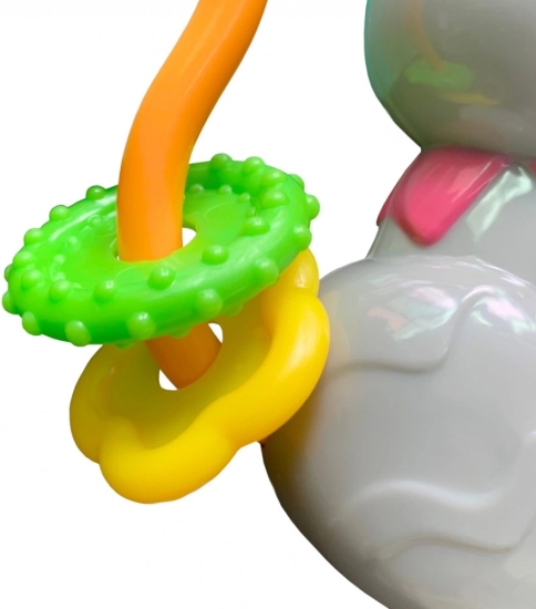 Zornăitorul are urechiușe pentru prindere ușoară și permite deplasarea inelelor colorate cu protuberanțe.