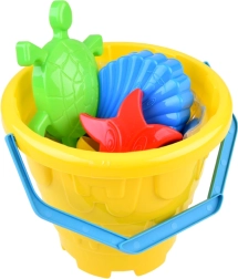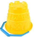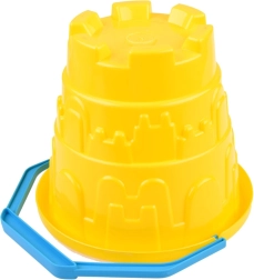 Găleată de plastic cu mâner albastru și forme în interior vă permite să transportați cu ușurință pe plajă sau în grădină.