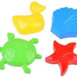 Patru forme de plastic sub formă de rățușcă, scoică, țestoasă și stea pentru modelarea ușoară și distractivă a nisipului dinamic.