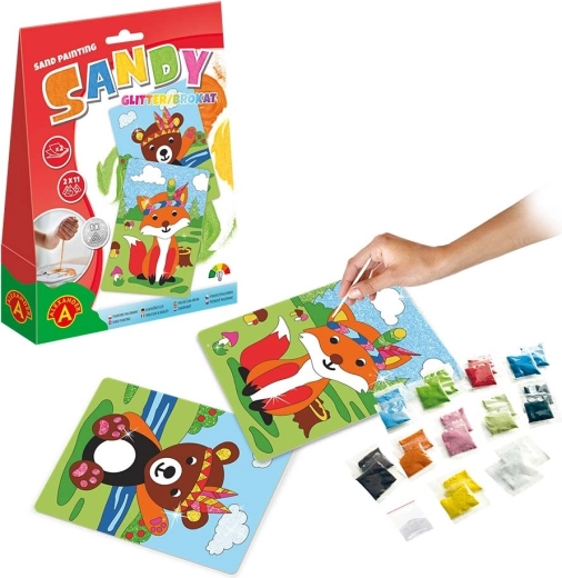 Conținutul pachetului: 2 șabloane (vulpe și urs), 22 de plicuri cu nisip colorat (2 × 11), 1 plic cu brocart, spatulă din lemn, suport din hârtie, instrucțiuni.