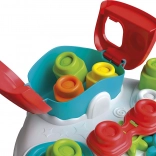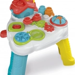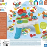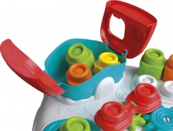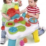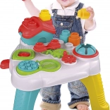 Masa oferă o gamă largă de activități pentru dezvoltarea abilităților motrice ale copiilor, cum ar fi roți dințate, catapultă pentru cuburi și bule care pocnesc.