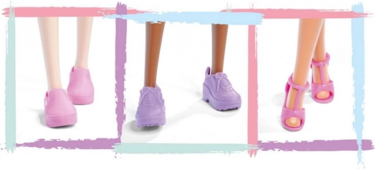 Adidașii sau sandalele roz și mov adaugă un plus de stil oricărei ținute și subliniază moda păpușii.