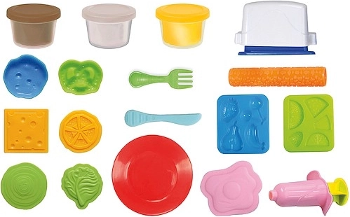 Acest set creativ de plastilină pentru copii transformă masa într-un joc. Copiii se pot juca de-a bucătarul și pot crea din plastilina moale toasturi, felii de brânză, legume și alte „delicatese”. Datorită instrumentelor ușor de folosit, modelarea este rapidă și distractivă.